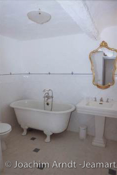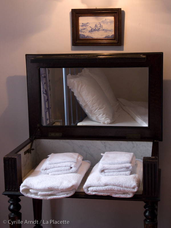One of the bedrooms - with a French double bed, an antique travelling marble top dressing table and a wardrobe - has an en-suite toilet room: with an ancient washbasin, a toilet and much storage space for suitcases and bags.